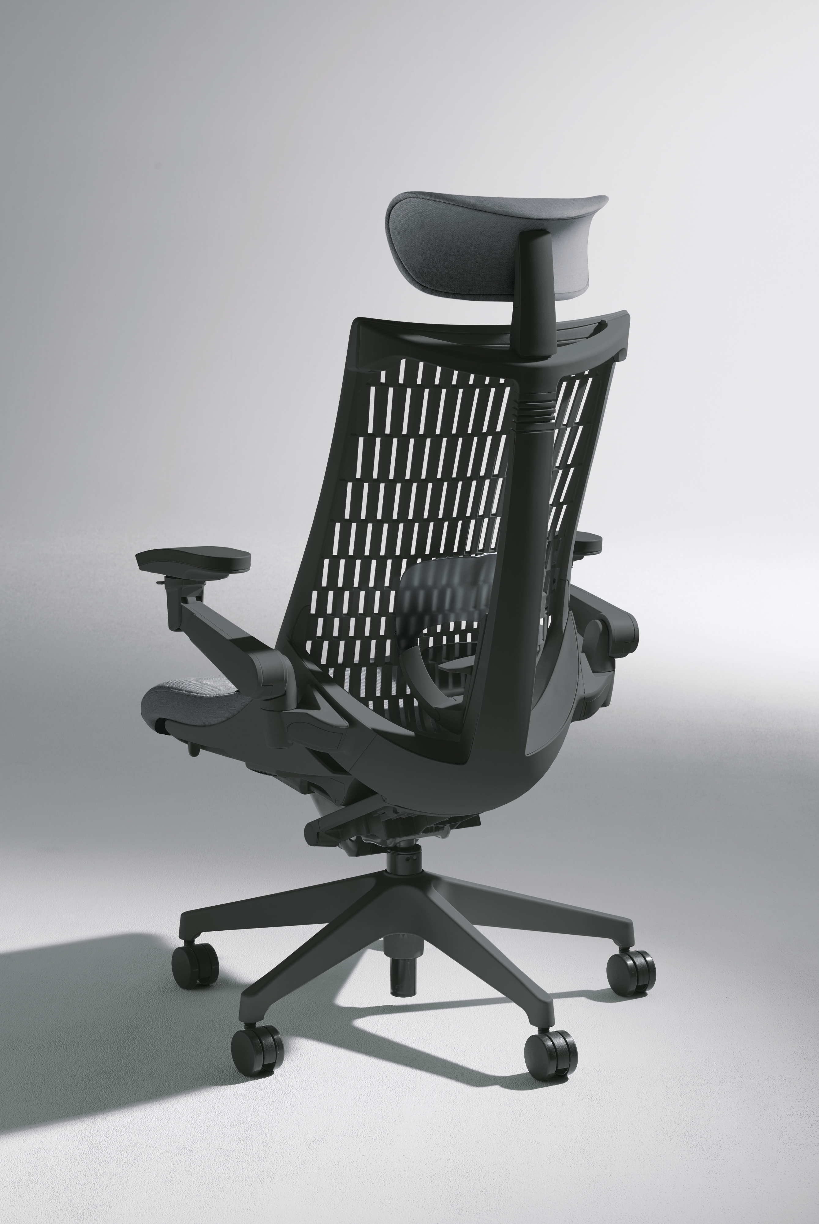 富山:作業時と休息時、両方の姿勢で適切に頭部を支えるための可動域を確保しながら、それをいかにして背面の支柱と一体感のあるデザインに収めるか、という点に最後までこだわりました。