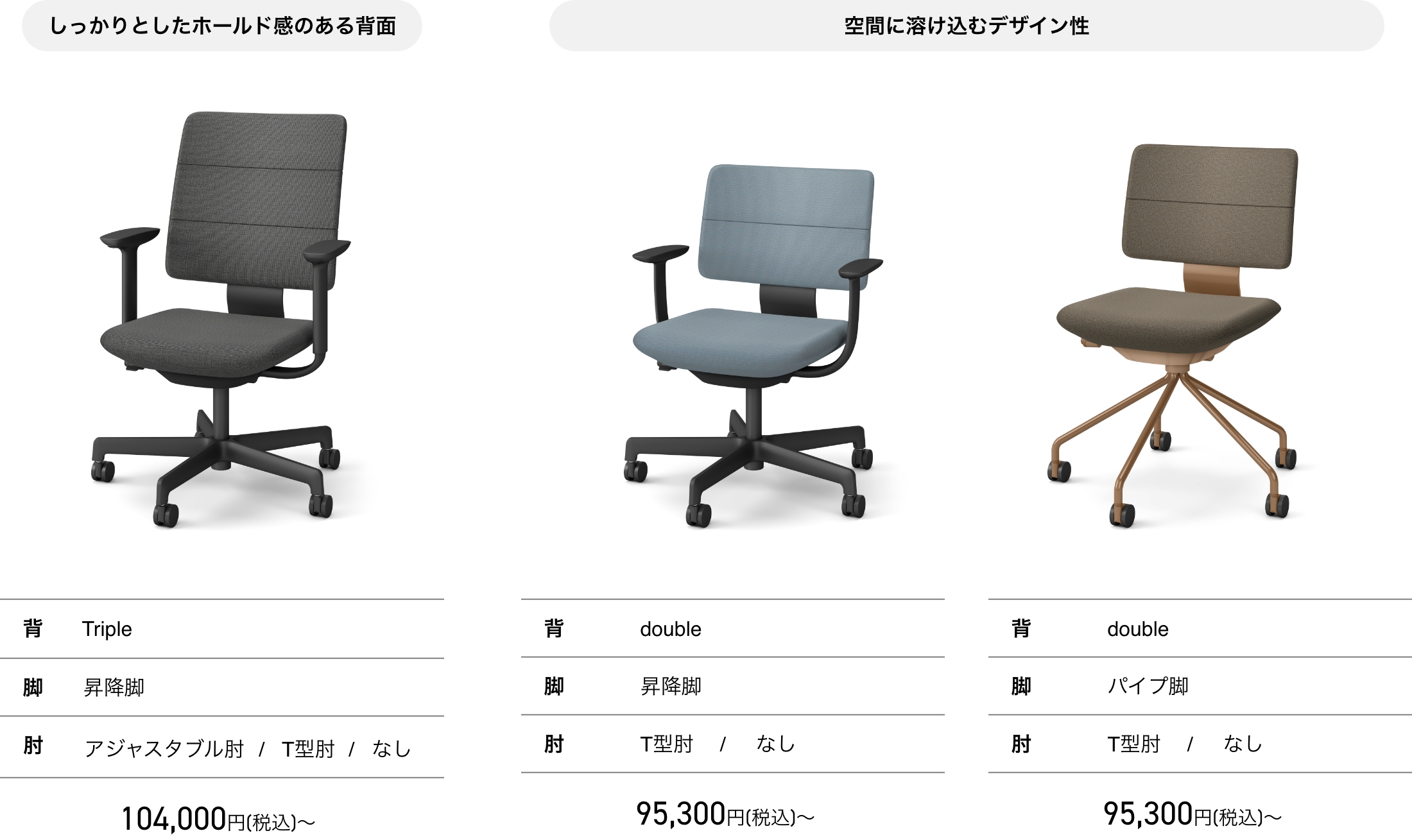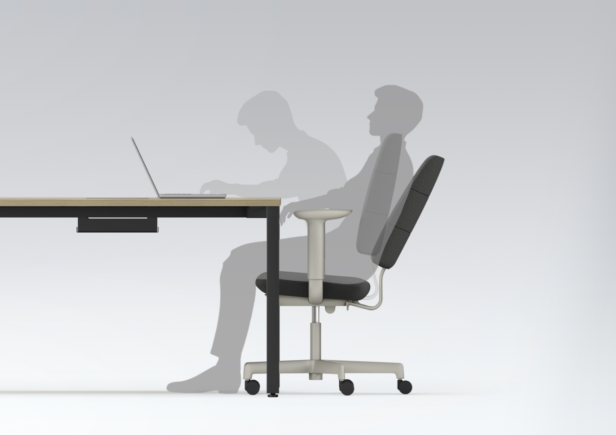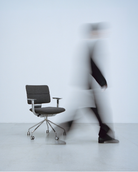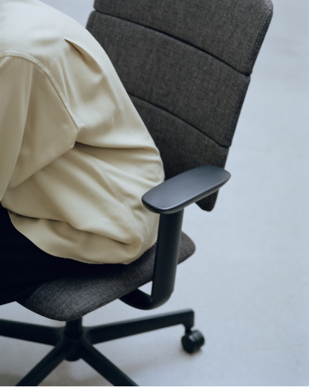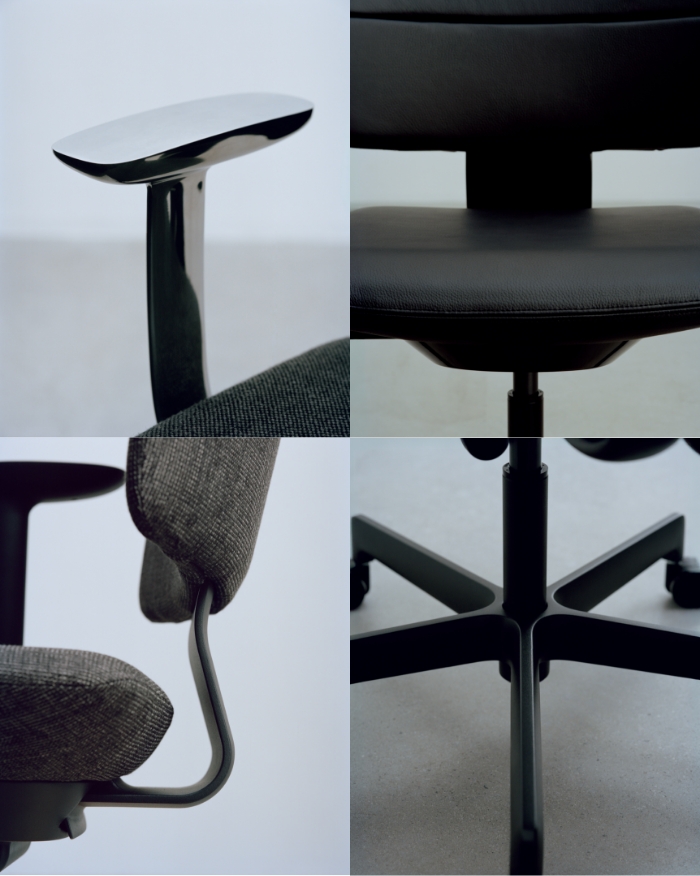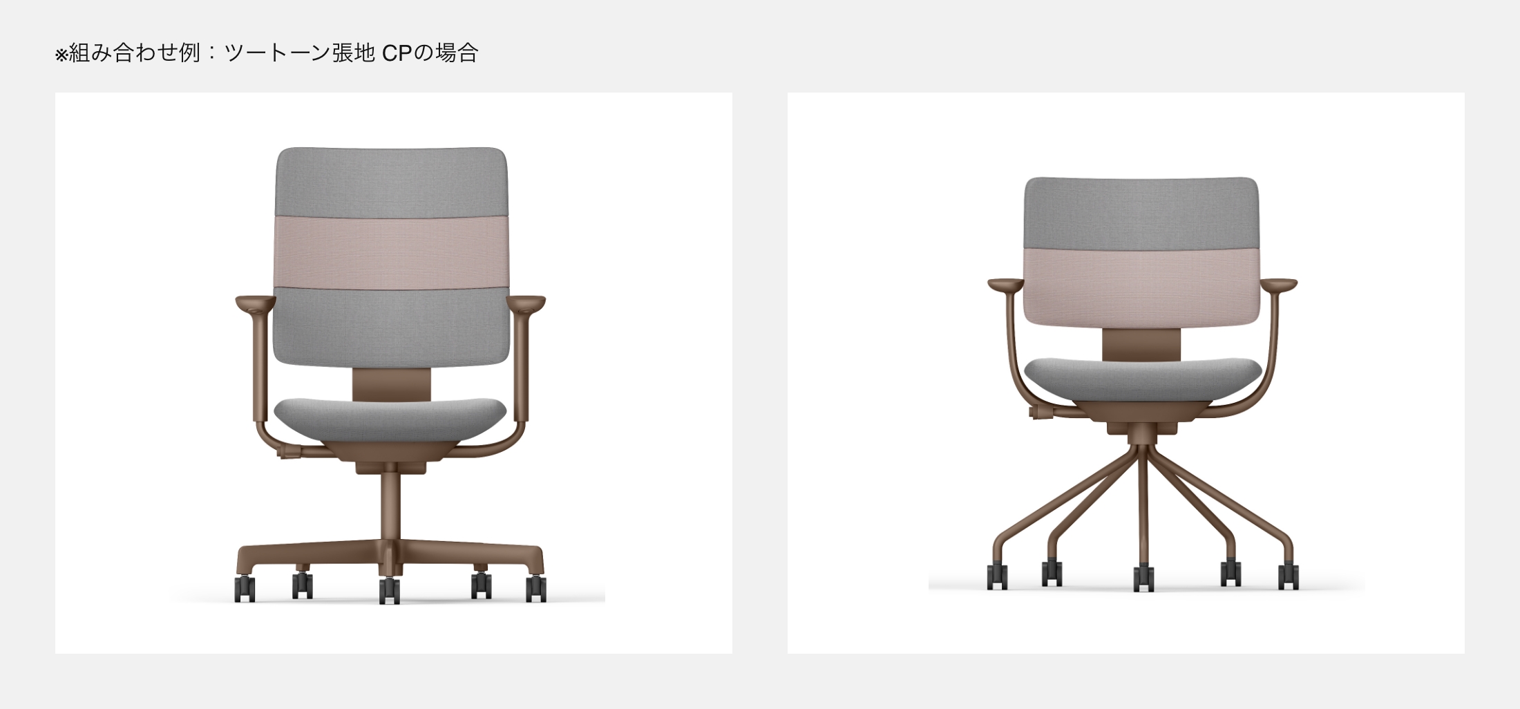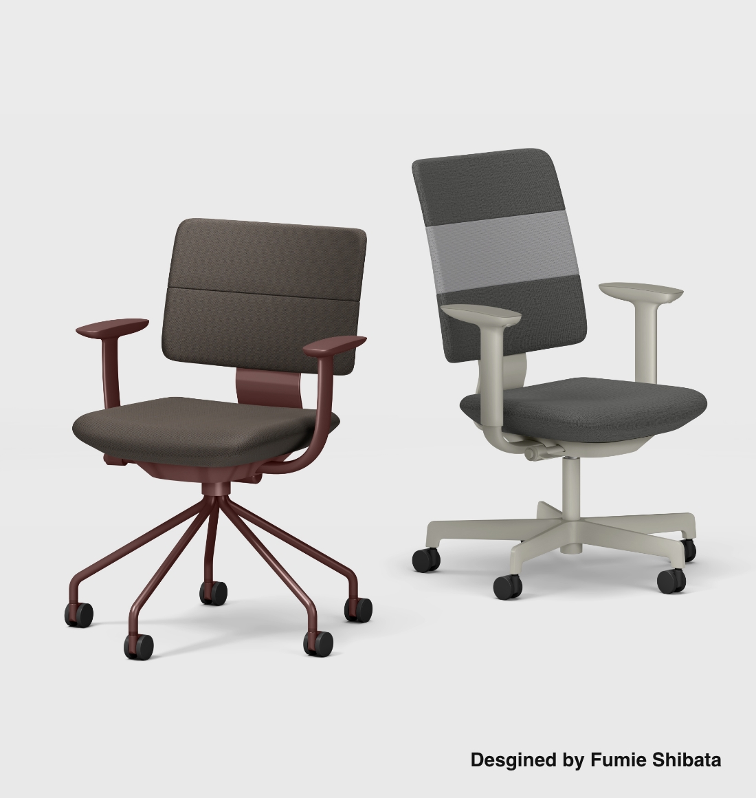 空間に複数台並んだときの「見えがかり(見た目の印象)」を重視して構想されており、アームレストや背面のシルエットがもたらす、オフィスチェアよりも「家具」らしい落ち着いた表情、座面と背面の分割やラインが視覚的に与える空間の軽やかな印象など、現代的な働き方を提案するプロダクトのデザインが実現しました。