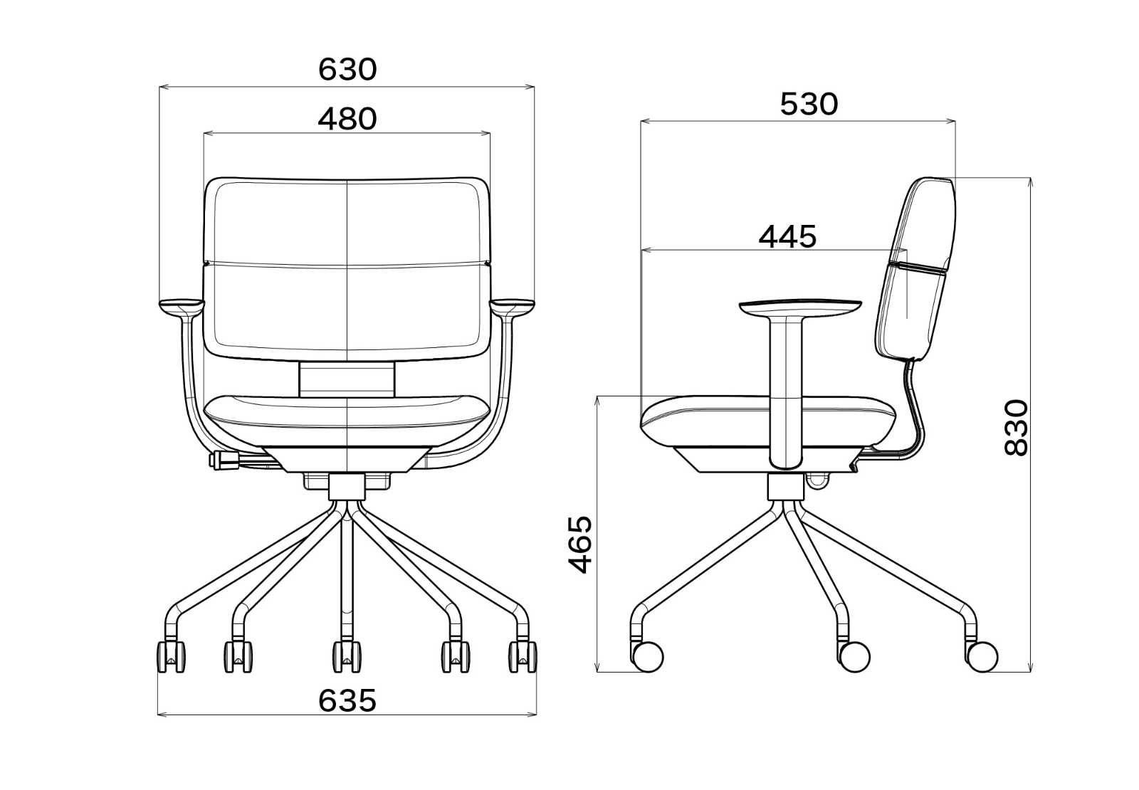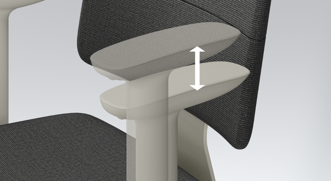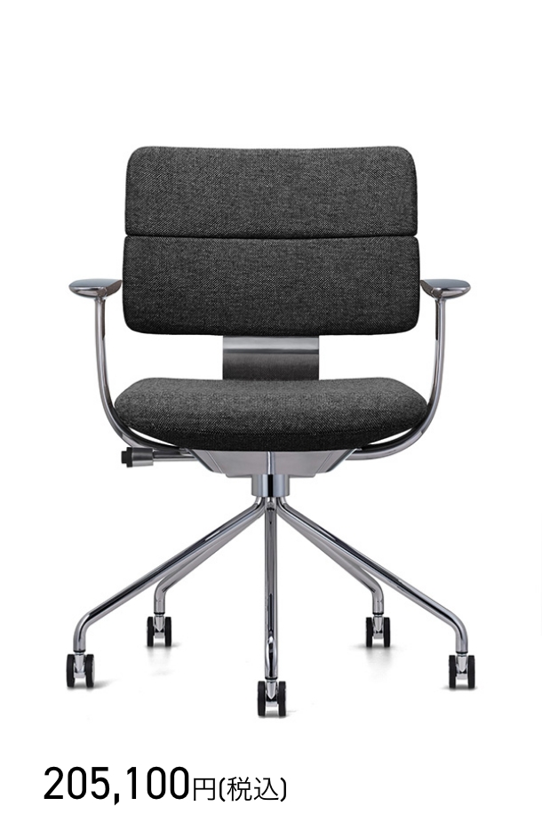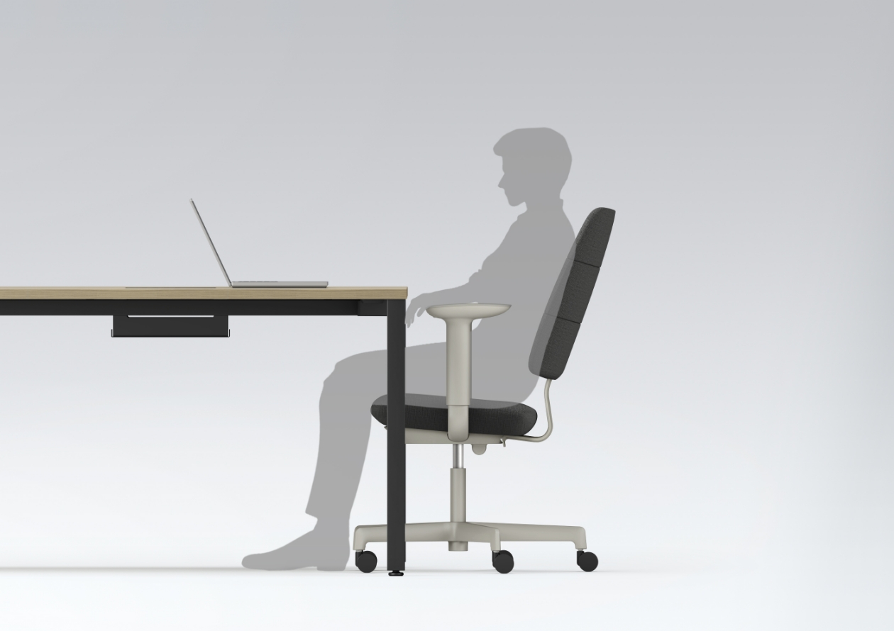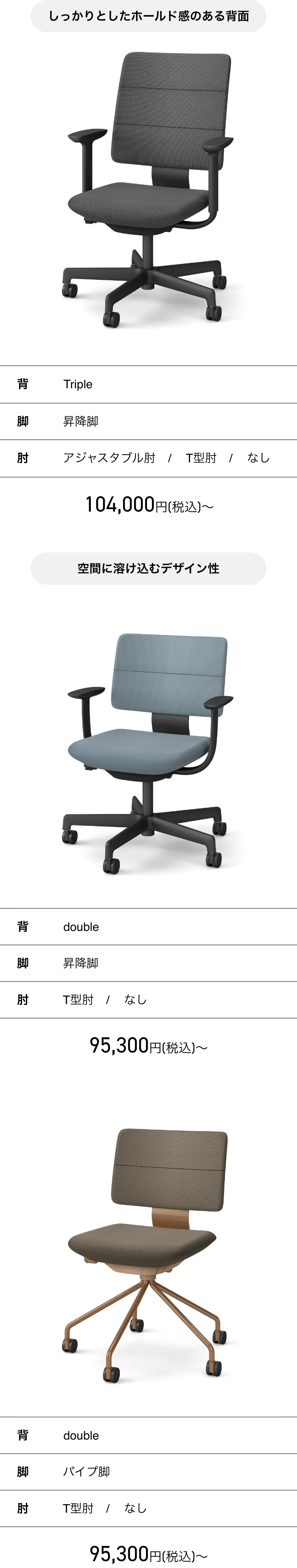 空間に複数台並んだときの「見えがかり(見た目の印象)」を重視して構想されており、アームレストや背面のシルエットがもたらす、オフィスチェアよりも「家具」らしい落ち着いた表情、座面と背面の分割やラインが視覚的に与える空間の軽やかな印象など、現代的な働き方を提案するプロダクトのデザインが実現しました。