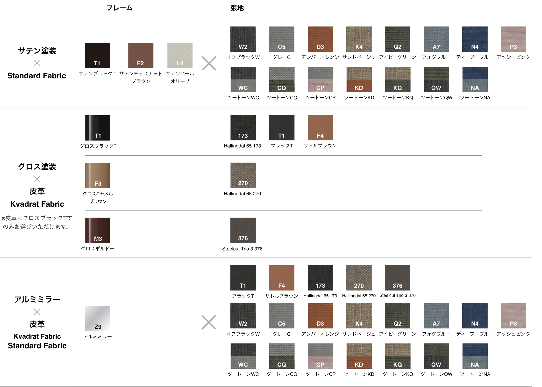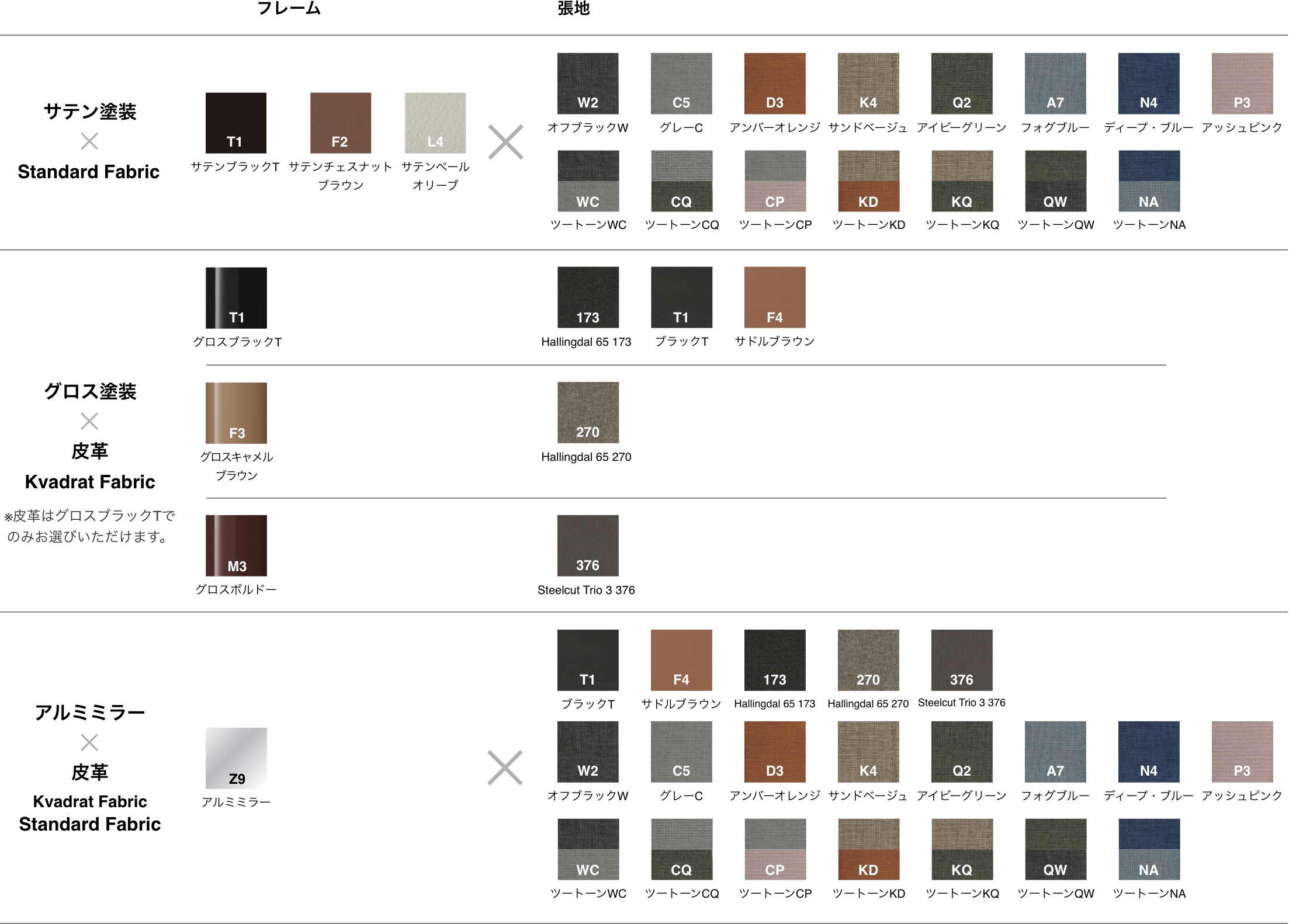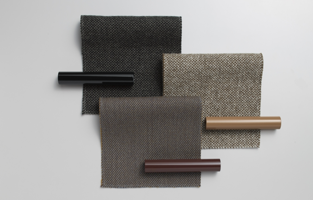 SHIGAのために新たに開発したグロス塗装は、温かみがあり落ち着いたキャメル、ボルドーと、定番のブラックの三色の張地を採用。北欧を代表するテキスタイルブランド“kvadrat(クヴァドラ)"の張地を組み合わせ、シックで上質なコーディネートを作り出しました。