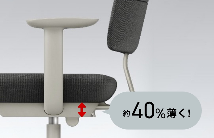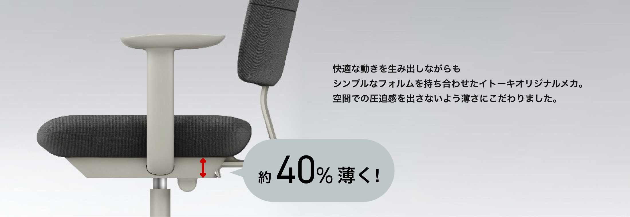 快適な動きを生み出しながらもシンプルなフォルムを持ち合わせたイトーキオリジナルメカ。 空間での圧迫感を出さないよう薄さにこだわりました。
