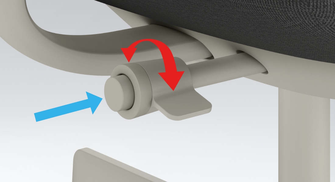 アジャスタブル肘の高さ調整は、肘当て前方下のボタンを押しながら上下に動かします(90㎜ストローク)