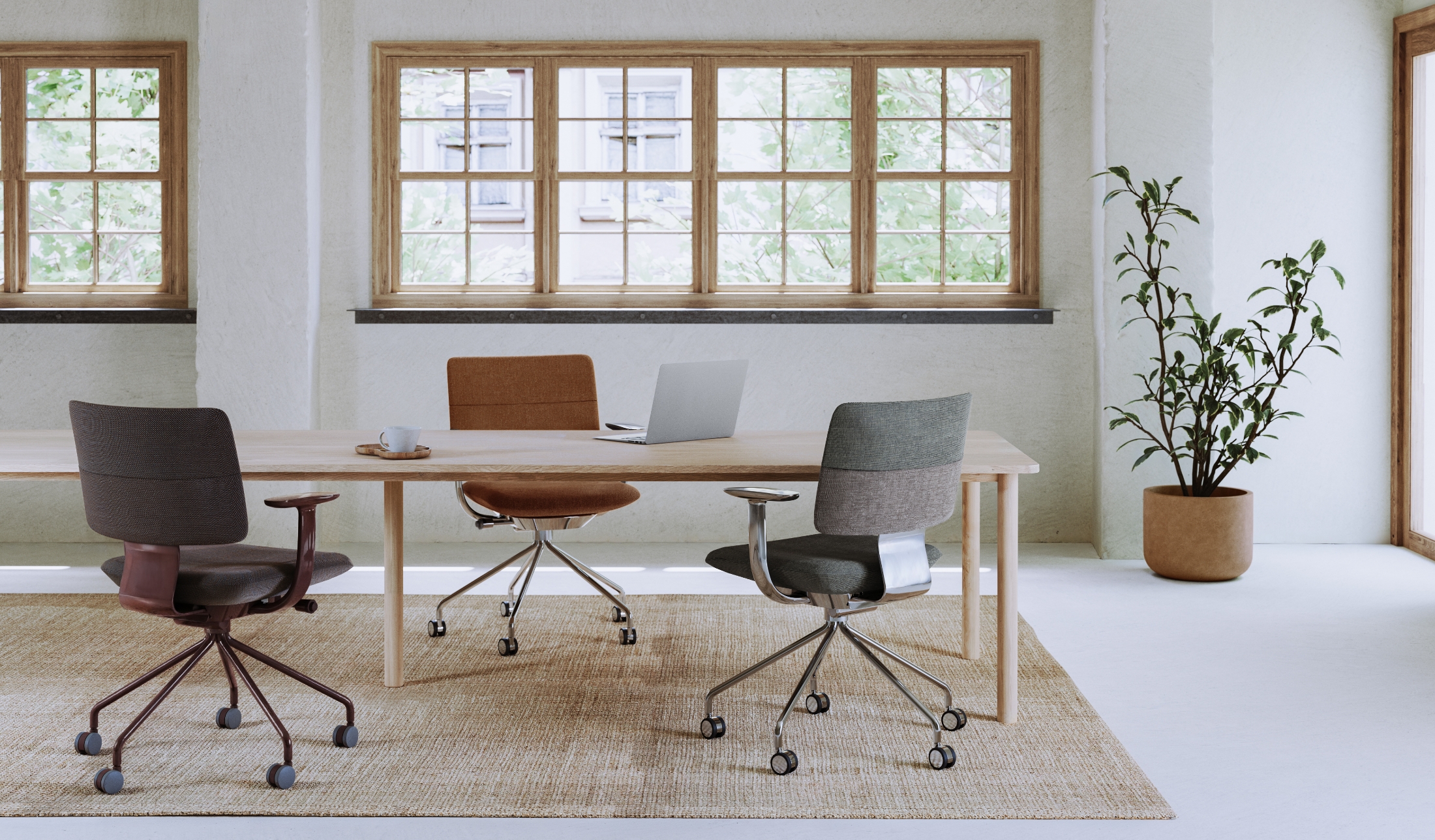 SHIGAは、ミニマムな美しさ、確かな機能、そして家具としての現代的なデザインを兼ね備えた、新しい時代のオフィスや働き方に呼応するワークチェアです。